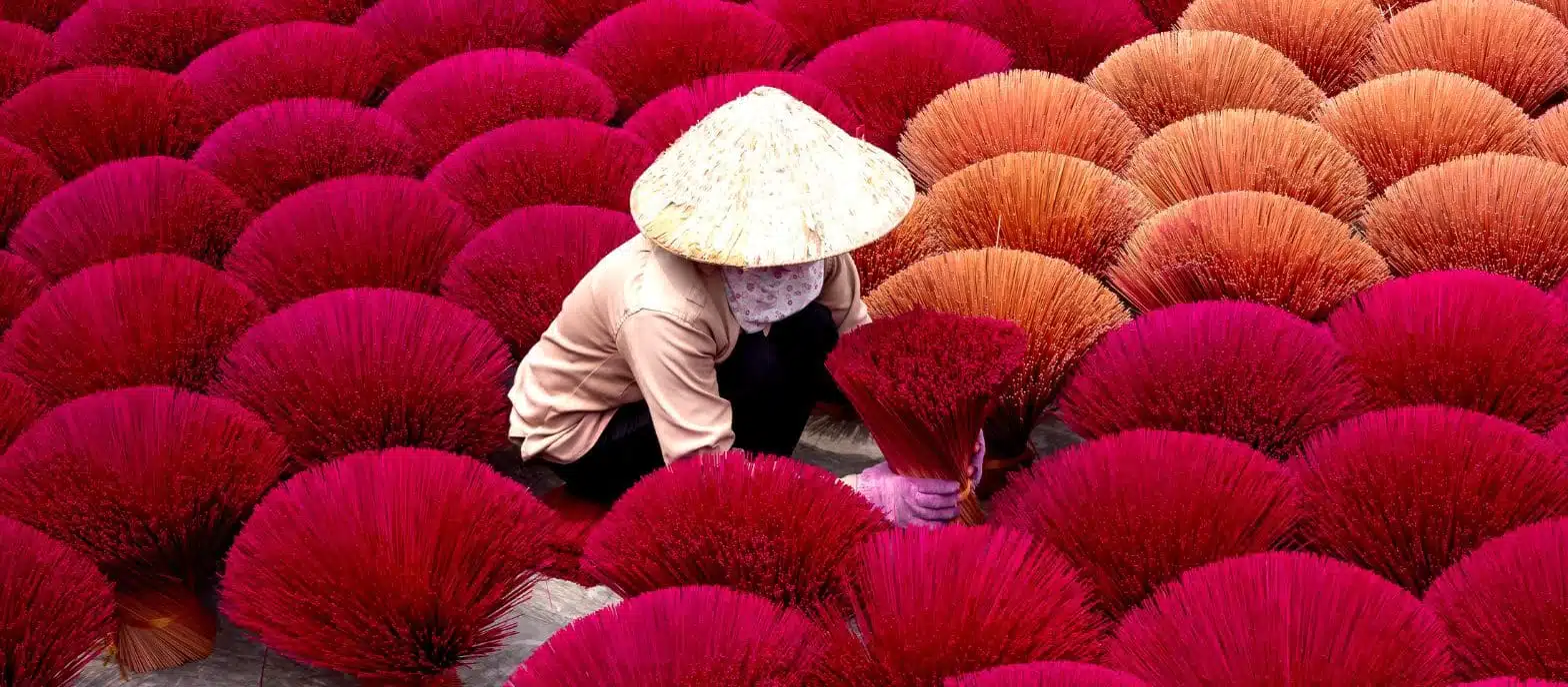 For centuries, this village supplied incense for royal ceremonies, pagodas, and festivals of the Imperial City. Today, it is famous for its vibrant bundles of incense—red, yellow, green, and purple—drying under the sun like blooming flowers.
